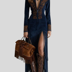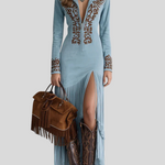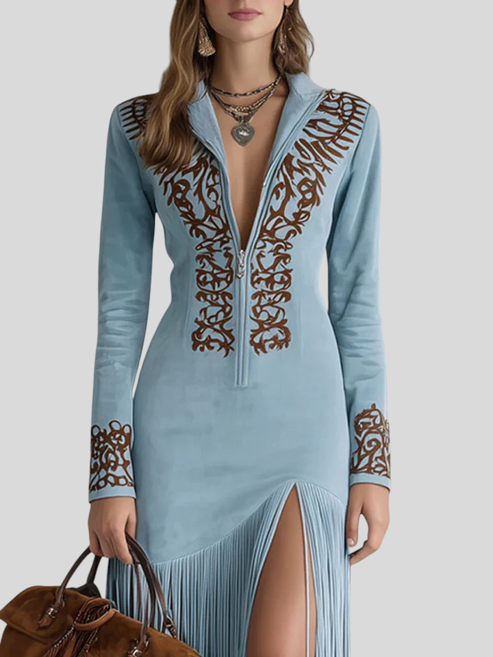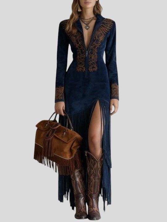 Ez a hímzett western ruha rojtokkal a tökéletes választás mindazoknak, akik a boho stílust és az egyedi statement megjelenést egyaránt keresik. A virágos hímzések egyedi karaktert teremtenek, míg a hosszú rojtos szegély boho eleganciát ad. A mély V-nyak nőies vonalat biztosít, így a ruha könnyen párosítható.