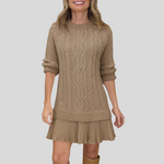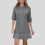 Ez a fonott mintás kötött ruha a tökéletes választás mindazoknak, akik a fonott eleganciát és a romantikus preppy-chic stílust egyaránt keresik. A kötött ruha cable knit mintával rendelkezik, amely klasszikus eleganciát ad, míg a rétegezett pliszírozott szegély romantikus részletet nyújt. A bordázott szegélyek strukturált befejezést biztosítanak, a finom kötött anyag pedig luxus viselhetőséget kölcsönöz. A mini hosszúság modern karaktert ad, így a ruha tökéletesen összehangolt választás.