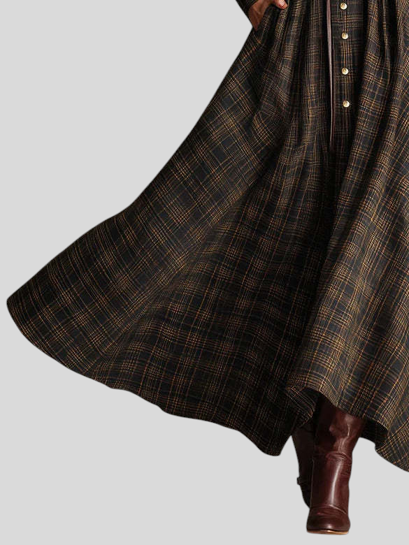 Ez a kockás kabát ruha övvel a tökéletes választás mindazoknak, akik a vintage eleganciát és a statement stílust egyaránt keresik. A kockás tartan minta időtlen karaktert teremt, míg a széles öv hangsúlyozza a sziluettet. A bő maxi szoknya elegáns mozgást biztosít, így a ruha könnyen párosítható.