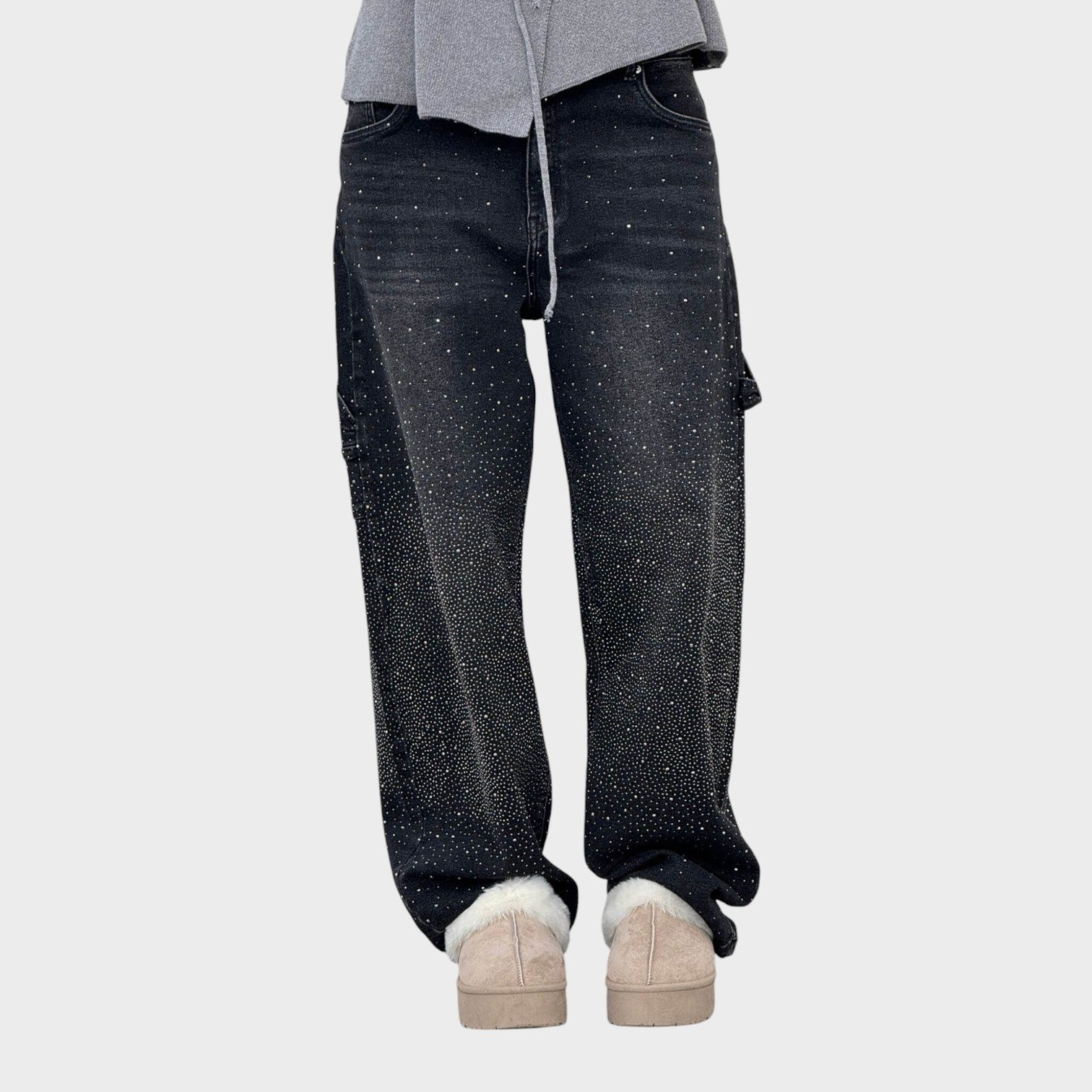 Ez a strasszos wide leg farmer a tökéletes választás mindazoknak, akik a csillogó részleteket és a modern statement stílust egyaránt keresik. A strasszos díszítés egyedi karaktert teremt és glamour eleganciát ad, míg a wide leg szabás modern sziluettet kölcsönöz. A bő szabás kényelmes mozgást biztosít, így a farmer sokoldalúan párosítható.