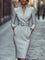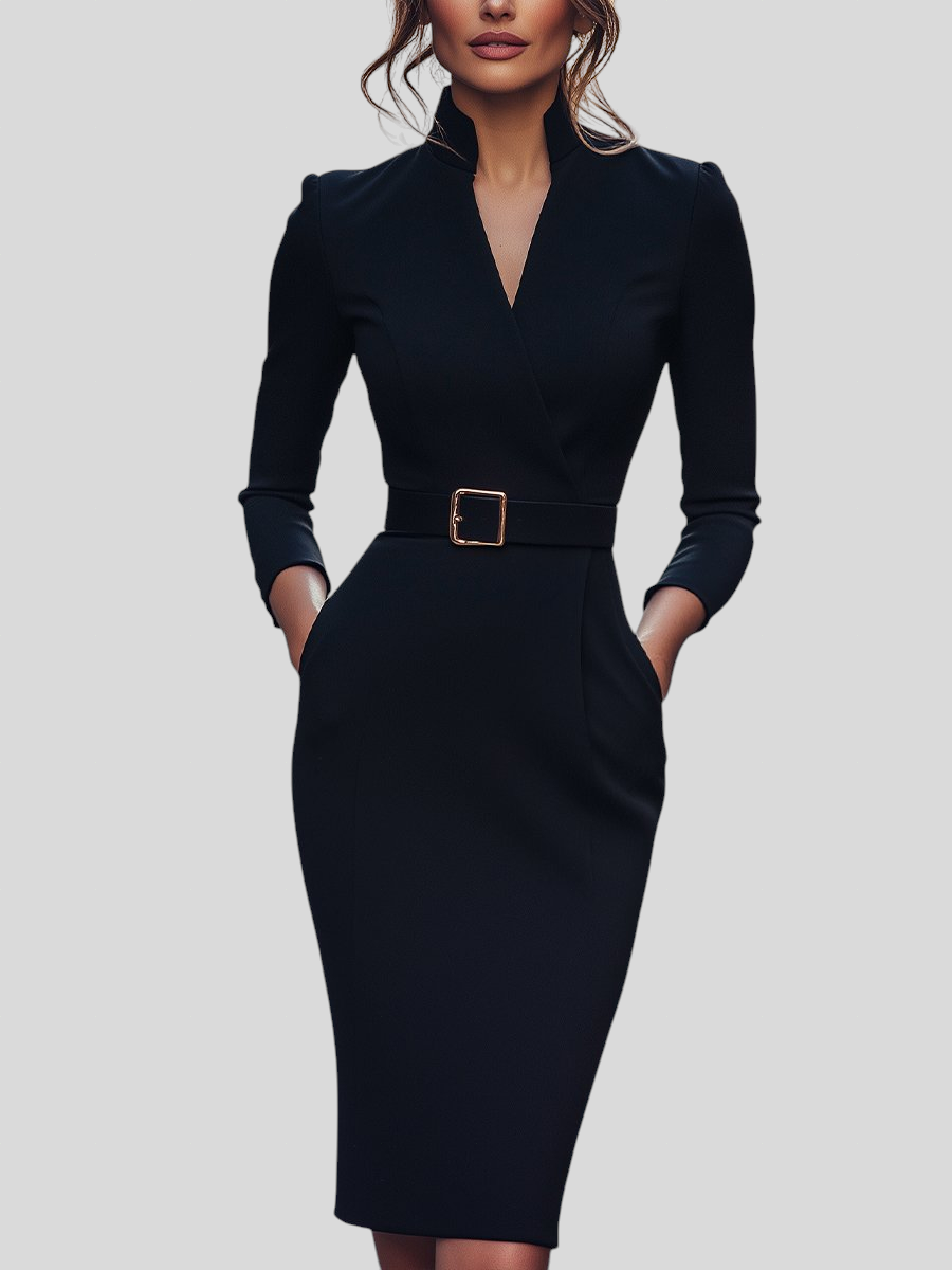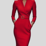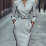 Ez az öves blézer ruha a tökéletes választás mindazoknak, akik a power dressing eleganciát és a kifinomult stílust egyaránt keresik. A blézer stílusú dizájn strukturált vonalat teremt és professzionális karaktert ad. A V-nyakú átlapolós kivágás nyújtja a nyakat és nőies eleganciát kölcsönöz, míg az öv a derékban hangsúlyozza a sziluettet. A hosszú ujjak kifinomult befejezést biztosítanak, a midi hosszúság pedig időtlen eleganciát ad. A zsebek praktikus részletet nyújtanak, így a ruha sokoldalúan viselhető. Akár magassarkúval elegáns megjelenéshez, akár bokacsizmával modern stílushoz párosítod, ez a ruha mindig statement választás.