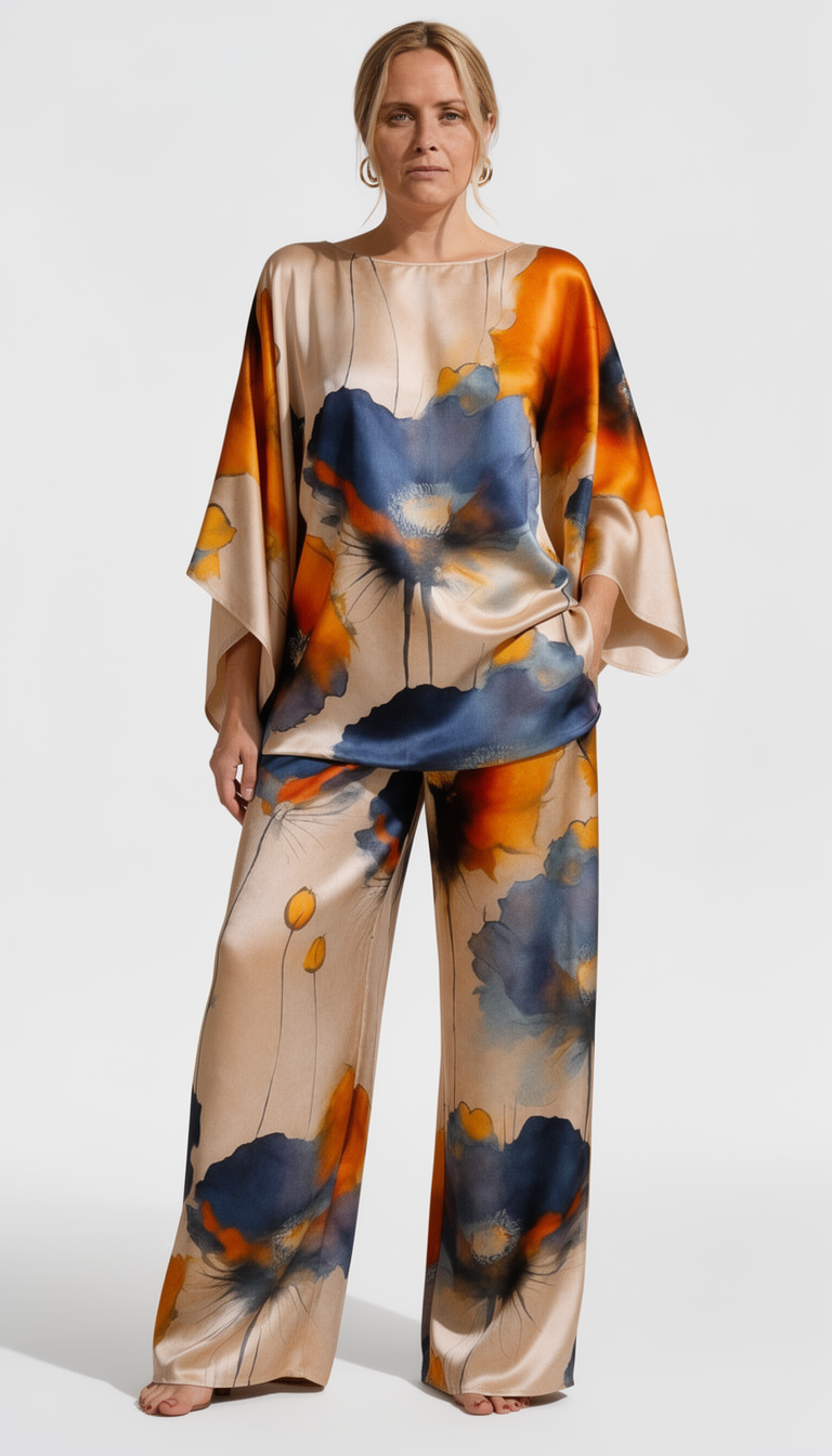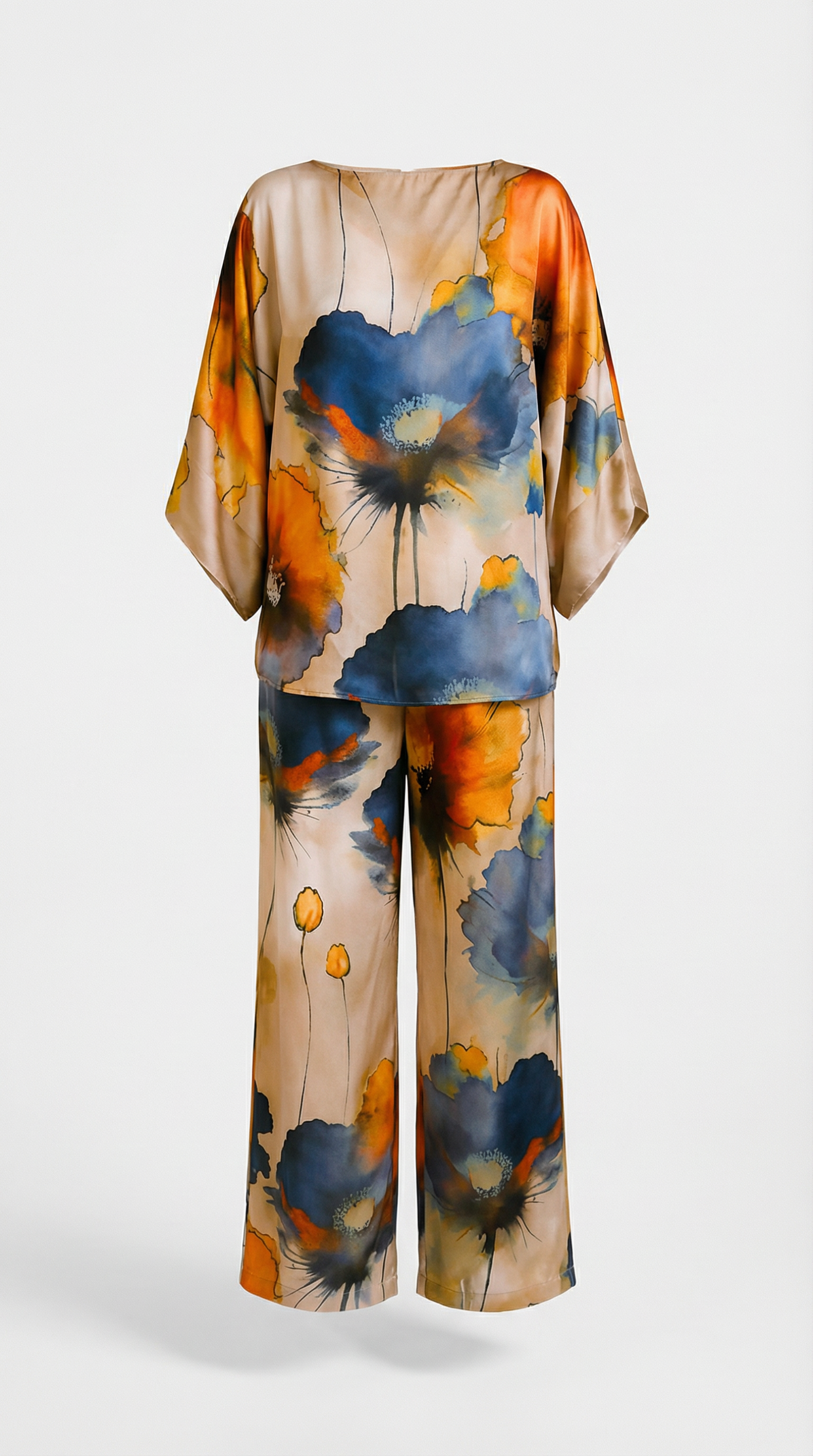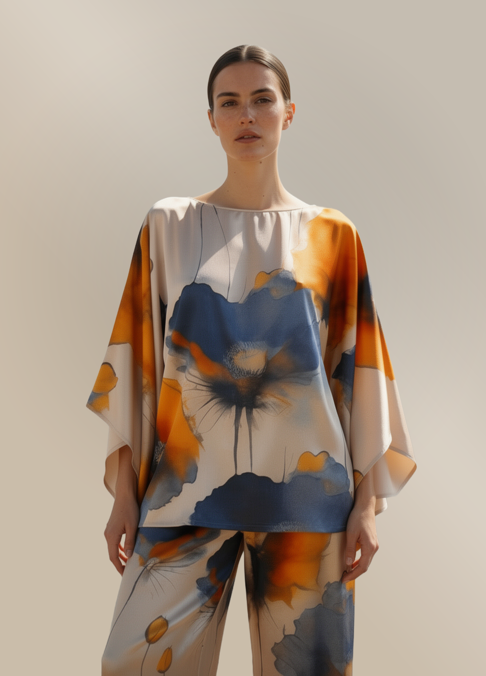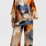 Absztrakt mintás kimono blúz és nadrág szett – művészi luxus!