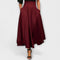 Ez a bő szabású maxi szoknya magas strukturált derékpánttal, oldalsó masnis kötéssel és bőséges A-vonalú szoknyával készült, amely nőies és elegáns megjelenést kölcsönöz. A sima, fényes anyag és a keringős bőséges szabás különleges mozgást ad viselés közben – legyen szó egy különleges alkalomról, esti rendezvényről vagy egy elegáns vacsoráról.