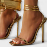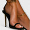 Xénia™ - Arany fém sarokkal és láncos bokapánttal díszített tűsarkú szandál